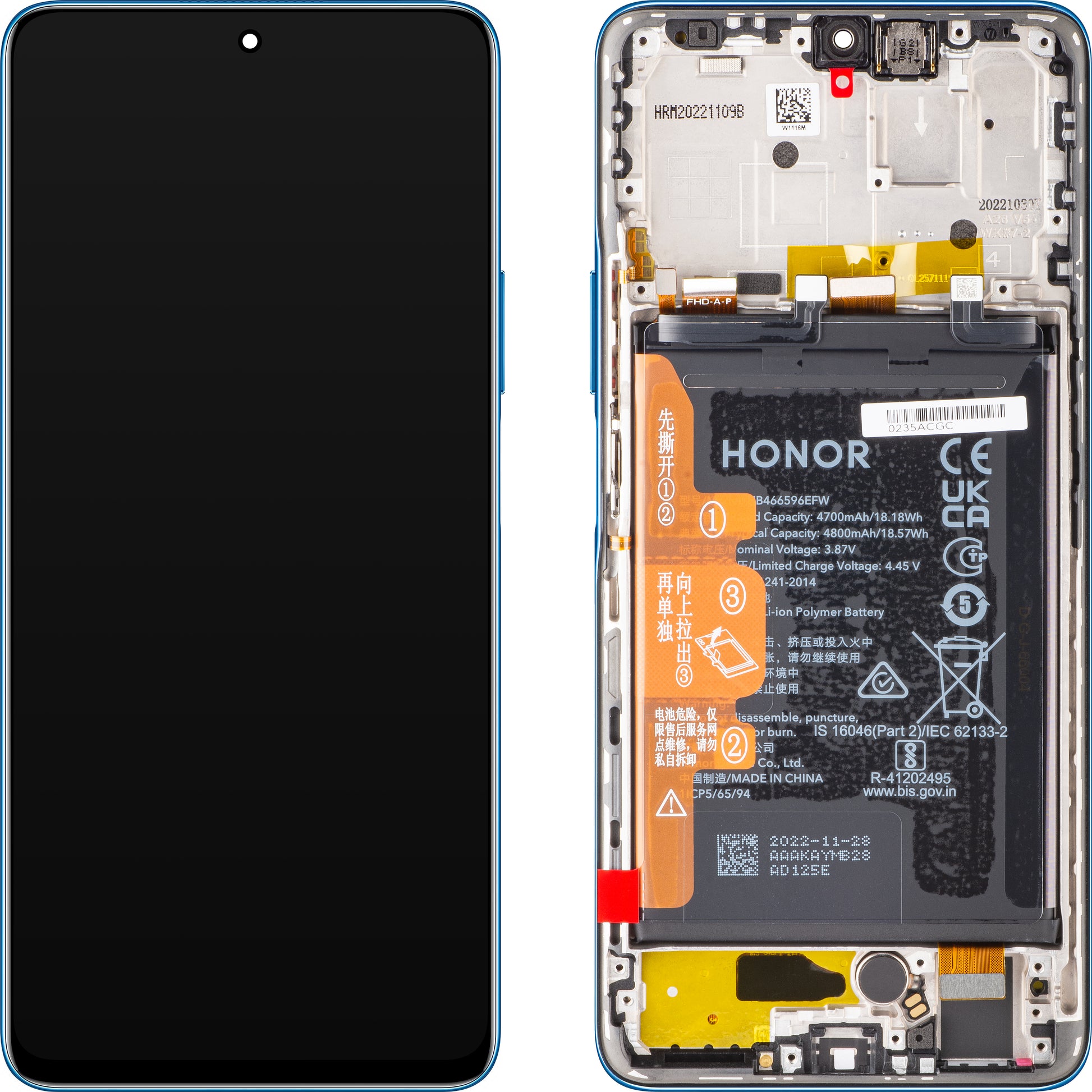 Display with Touchscreen Honor Magic4 Lite, with Frame and Battery, Blue (Ocean Blue), Service Pack 0235ABST
